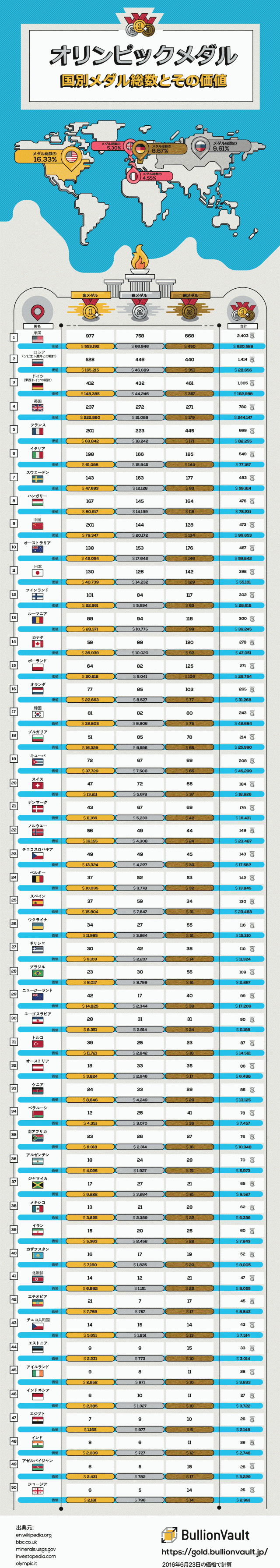 それでは、下記のインフォグラフィックスで、メダル獲得数がトップ50位までの国々のそれぞれのメダルの総数とその価値をご覧ください。