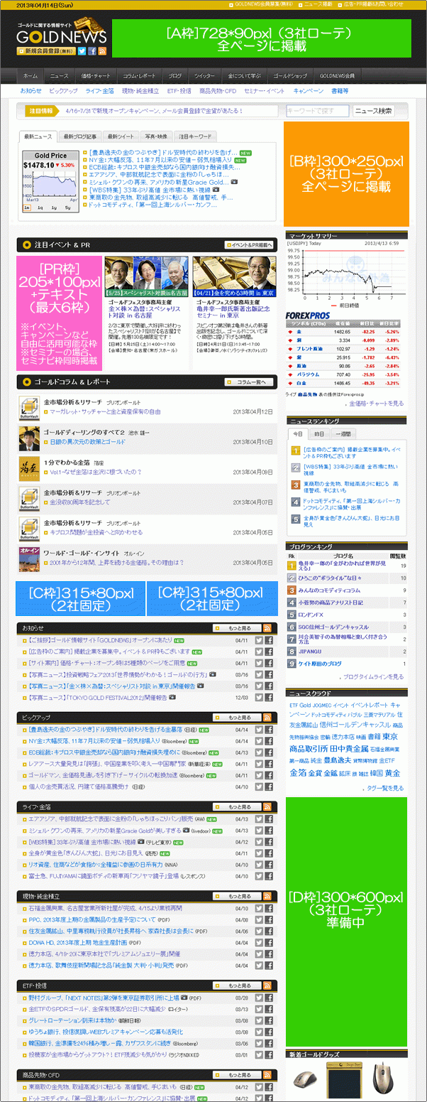 GOLDNEWS(ゴールドニュース)では、サイト上に以下の広告枠、及びイベント・キャンペーンなどのPR枠をご用意しております。金・ゴールドに関心のある投資家の方や、ゴールド業界向けのPRなどニーズに併せてご活用いただければと思います。