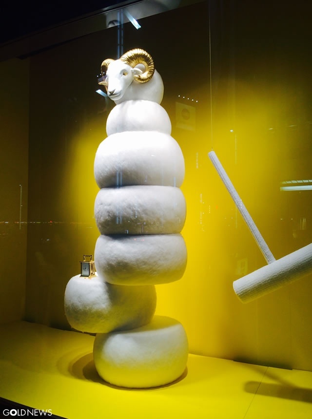 東側のウインドウでは黄金羊の雪だるまによる「だるま落とし」が。