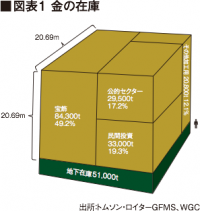 森田 世界に流通している金は2011年末時点で約17万トンと言われていま す。17万トンというと多そうな気がしますが、縦・横・ 高さ約20メートルの立方体に収まってしまうほど、少ない量しかありません。 まだ掘り出されていない、確認されている地下に眠っている金は約5万トン。両方合わせても約22万トンしかない希少な金属なのです。