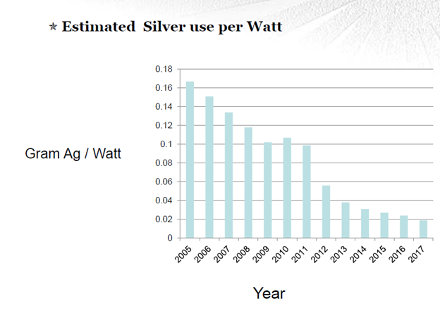そのため、太陽発電のパネルにおいては、市場にリサイクルされて戻ってくる量が少ないために供給を増やすことが、長期における価格への重要な要因となります。触媒として利用されている銀は、常に1億オンスはあると推測されています。そのため、この業界が触媒として化学反応のために銀を利用する限り、この量の銀は市場に戻ってくることはありません。しかし、もし科学的な発展で、銀の利用量を削減できる、もしくは銀を利用しない方法が開発された場合は、ここで利用されている銀が市場に戻ってくるかもしれません。これは、常にその可能性を潜んでいますが、もし銀の価格が他の同様な貴金属よりも高ければ、この可能性はさらに高まることとなります。