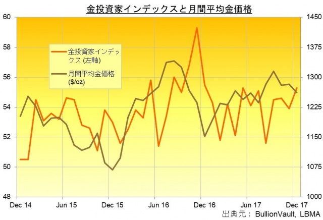 金価格はドル建てで1.6%下げ、5ヶ月ぶりの低値を付けていました。そして、金投資家インデックスは2017年に金価格と逆の動きを11回することとなり、5月の最高値とほぼ同水準の55.3と、11月の53.9から上昇していました。