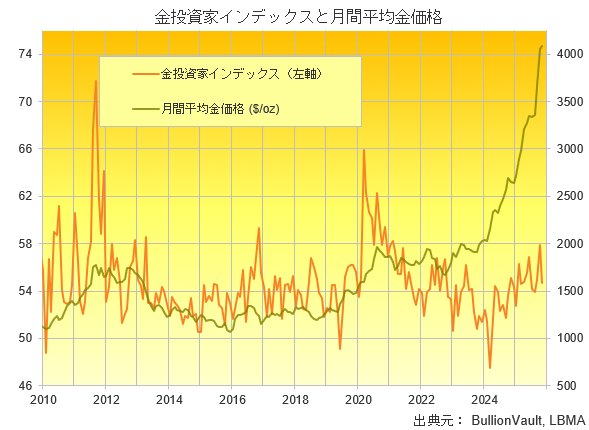 これにより、実際の現物売買取引データのみから算出されるセンチメント指標「金投資家インデックス」は、10月の56か月ぶり高値から3.2ポイント低下し、54.7と3か月ぶりの低水準となった。