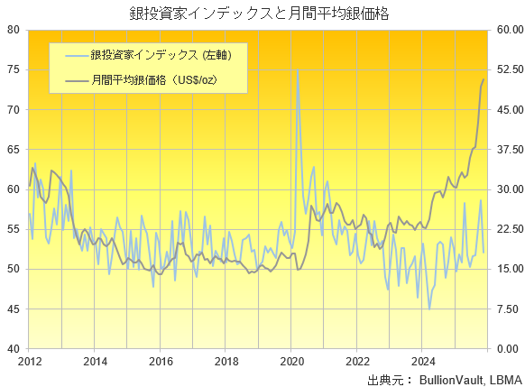 その結果、銀投資家インデックスは6.6ポイント低下し、52.1と8月以来の低水準となった。