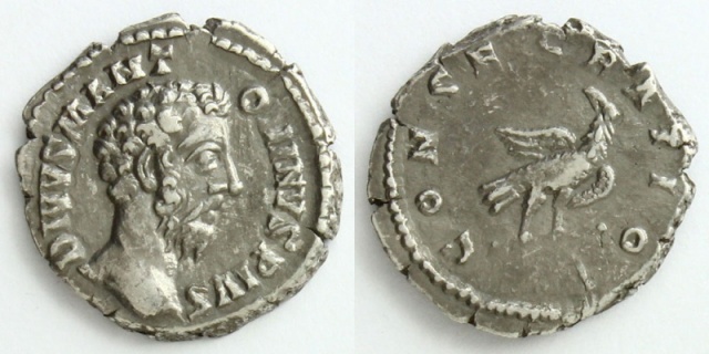 上のコインはマルクス・アウレリウス帝が崩御した年、亡き皇帝が神に列せられたことを記念して造られました。裏面には今にも羽ばたこうとする大鷲が表現されています。
