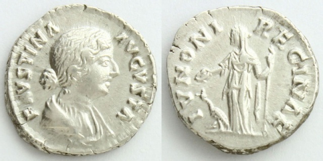 上はマルクス・アウレリウス帝の皇妃ファウスティナのコイン。裏面には女神ジュノー(ユーノー)が表現され、その足許には一羽の孔雀が控えています。