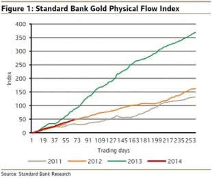 我々はアジアでの現物需要を過去5年にわたって毎日追いかけているが、2月末辺りから現物の需要がすっかり落ち込んでいる。需要が完全に無くなったわけではないが、その勢いは大きくブレーキがかかっています。2014年のここまでの様子をみていると、2013年よりも2012年にその動きが似ています。下のFigure1では2012年と2014年の需要線がほとんど重なっているのがわかります。2013年はゴールド価格が1700ドルから1300ドル以下まで下がる過程で、東アジアのゴールドの加工需要は前年比30%も増加しました。しかしながら2014年の値動きは1300ドル以下でも同じような需要は出てきていません。