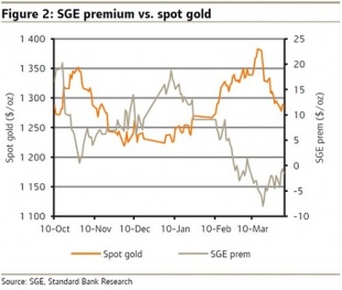 この実需現物需要の弱さはSGE(上海黄金交易所)のプレミアムに現れています。ゴールド価格が3月半ばの1400ドル手前から月末の1300ドルまで下がっても、SGEはディスカウントでした。そんな中、一つのポジティブな考え方はゴールドがこれ以上大きく下げるとするならば、アジアの実需需要は改善し、ちょうど昨年がそうだったように、下値を支える役割を果たすという見方です。