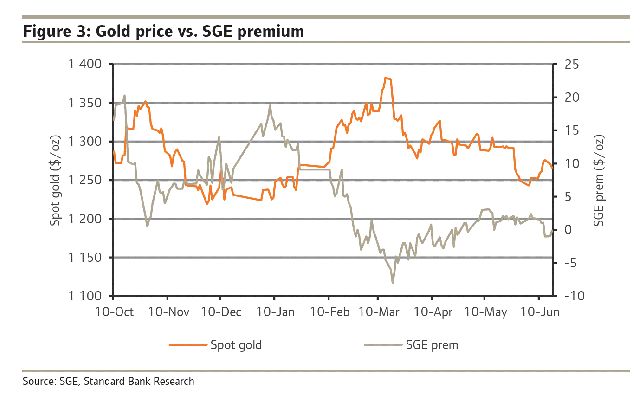 今年のアジアのゴールド需要は貧弱でした。中国の香港経由のゴールド輸入は統計が出ている5月までは強い数字でしたが、6月、7月、8月とその勢いは弱まると予測します。上海黄金交易所(SGE)のプレミアムが4月から下がっており、ほぼゼロに近いところにあるということが、端的に弱い需要を示しています。SGEのプレミアムとゴールド価格の関係をみれば、中国のゴールド需要がここ数ヶ月は価格に大変神経質になっているのがよくわかると思います。SGEのプレミアムがゼロもしくはマイナスであるということはゴールドを輸入する必要性もないということを意味します。