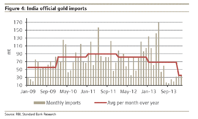 それとは対照的にインドのゴールド需要は昨年6月から弱いものになりました。その背景にはゴールドの輸入関税が4%から6%に2013年1月に引き上げ、6月には6%から8%にまで、そして8月にはなんと8%から10%にまで増税されたことがあります。この輸入関税増税のために、ゴールド輸入量の月間平均値は2012年の81トンから2013年の68トンへ大きく減少し、さらに驚くべきは、昨年8月から今年2月までの「公式」なゴールドの輸入は一月あたり24トンにまで落ち込んでいるという事実です(Figure4)。