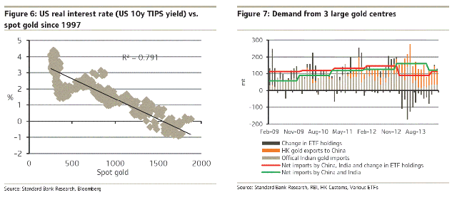 Bloombergの調査によれば10年物米国債の名目金利は2015年Q1には3.2%への上昇が予想され、もしインフレ率が2%であれば、実質金利は1.2%くらいだということになります。現在の実質金利(10 year TIPS yield ? 10年物Treasury Inflation-Protected Securitiesの利回り)0.3%と比べるとはるかに上がっていることになります。もしFigure6の相関関係がそのままちゃんと起こったとすれば、2015年Q1のゴールド価格は1100ドルに近いということになります。
