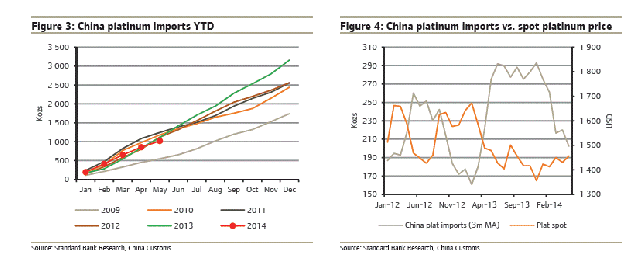 中国のプラチナ輸入量は輸出入統計を見る限り、中国のプラチナ輸入量は減少しており、4月の205k tozから5月は165k tozになりました。ことしこれまでの現物需要は弱く、前年同期とくらべてみても、ここ数年でもっとも需要がないことが実感できます。昨年2013年は6月に大きな価格下落があり、そのおかげで需要が伸びました。今年もそういうことがあるかもしれませんが、これまでのところはプラチナ、シルバー、ゴールドとも中国の輸入量は減少したままです。