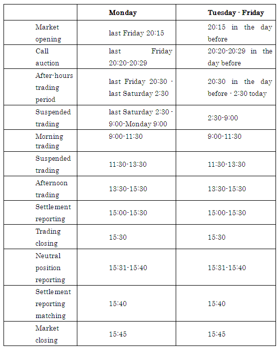 取引日は月曜日から金曜日まで、取引時間は一日あたり3つの時間帯に分かれます。夜間取引もあるので一週間のスタートは前週の金曜日の20:15。そしてその他の平日は前日の20:15がオープニングになり、20:20-29までCall Auctionという名前の板寄せを行い、その後20:30から翌日02:30、9:00 から11:30、13:30から15:30という取引時間です。各セッションの間には2時間もの休憩時間があり、昔のTocomを彷彿とさせます。休日の翌日は午前8:45にオープニング、その後は普段と同じ3セッションがあります。