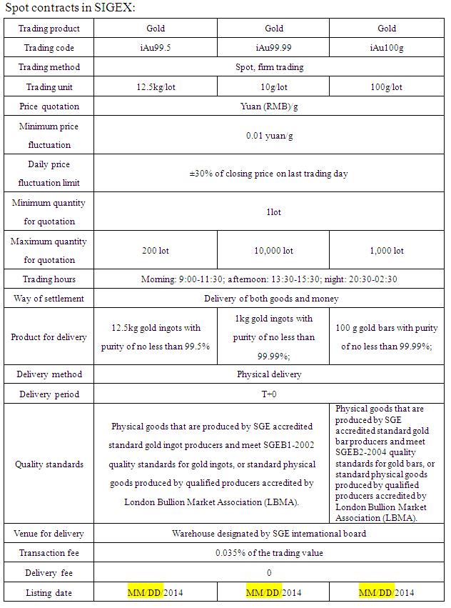 そのSGEが2013年9月に設置された上海自由貿易試験区(Free Trade Experimental Zone)を利用して、海外勢の取引を可能にする新たな取引市場を開設しようとしています。(9月後半開始予定)まずSGEはShanghai International Gold Exchange Co.,Ltd.(SIGEX)という会社を自由貿易試験区に設立しました。SIGEXはSGEの国際ビジネスを促進し、国際メンバーの自由貿易試験区での取引にかかわるすべてを管理運営することになりました。この国際メンバーというのは新しく設置されたカテゴリーです。その条件は