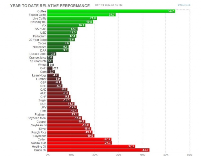 最も下がったのはやはり原油です。年初から43.3%の下落。灯油そして天然ガスなどのエネルギーがワースト1、2、4位となっています。貴金属ではシルバーが一番大きく下落し、19.2%の下げとなりました。そしてプラチナが14.2%の下げ、ゴールドは年末にかけて年初のレベルまで戻してほとんど動きなしの2.3%の下げでした。円安の動きが非常に大きい印象がありましたが、それでも12.2%の下げであり、原油をはじめとするエネルギーに比べるとその下落幅はさして大きくないとさえ感じてしまいます。しかし改めて米ドルに対する各通貨の動きと比べてみると(下図)、主な先進国通貨の中ではやはり日本円の下落が目立ちます。結果論でいうと2014年のベストトレードはコーヒーのロング、その次は原油のショートであったと言えます。貴金属ではパラジウムのロング、シルバーのショートが最もよいパフォーマンスでした。そして通貨ではドルロング円ショート。そしてもう少し考えると円建てパラジウムが実は29%の上昇でした。日本の投資家は年初にパラジウムを買っていれば非常によい投資になったはずです。