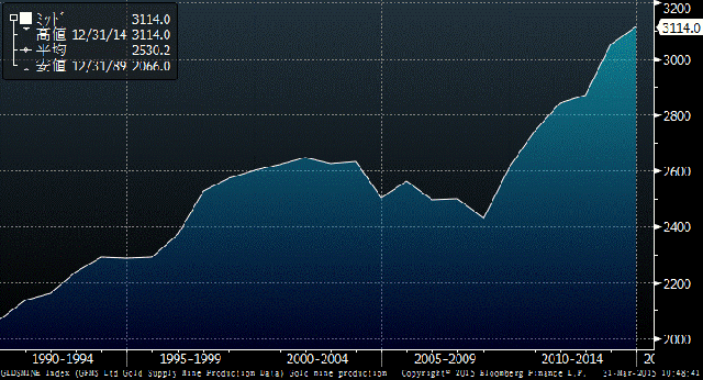 昨年11月後半とある会議で鉱山会社大手のGoldcorpの作ったスライドショーによると今年2015年は、ゴールド鉱山生産のピークになりそうということです。