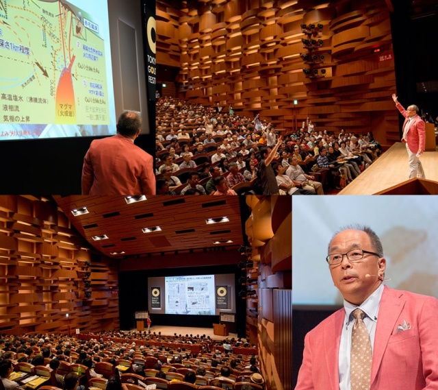 熊本大学准教授、「戦う海洋火山学者」横瀬久芳氏の基調講演。横瀬教授は「ジパングの海- 資源大国ニッポンへの道」(講談社+α新書)の著者であり、「海洋火山学者」。日本の海にはゴールドをはじめとした資源がたくさん埋まっているとして、その可能性を自らの採掘活動を通して説明。大学の教授先生とは思えないような軽やかなトークでした。