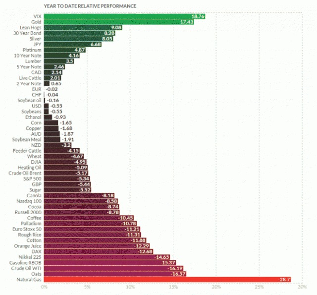 今年に入って上昇しているのは、VIX(Volatility Index:恐怖指数、シカゴオプション取引所のボラティリティインデックス。S&P500のオプションボラティリティを元に算出)が約19%上昇しており、これが今年ここまでのパフォーマンスのトップ。ゴールドはそれに次ぐ17.4%の上昇となっています。この二つがずば抜けたパフォーマンスとなっています。3位のLean Hogs(豚(赤身豚肉)先物!)と9位のLumber(木材)、12位のLive Cattle (生牛)以外は全て、恐怖指数と債券(米国債)、貴金属(ゴールド、プラチナ、シルバー)、そして通貨(日本円、カナダドル)となります。このラインアップは一目見れば分かりますが、まさに投資家が不安なときに買ういわゆるディフェンシブ(defensive;守備的な)ものばかりです。VIXやゴールドはその代表格ですが、リスクオフとして目立って買われている通貨は日本円、カナダドルそして米国債は短いものから長いものまで満遍なく投資家によって買われていることが分かります。シルバーは8.26%、プラチナは4.98%それぞれ上昇していますが、昨年下がりすぎた分、同じ貴金属であるゴールドに引き上げられている分があるにしても、立派な結果となっています。