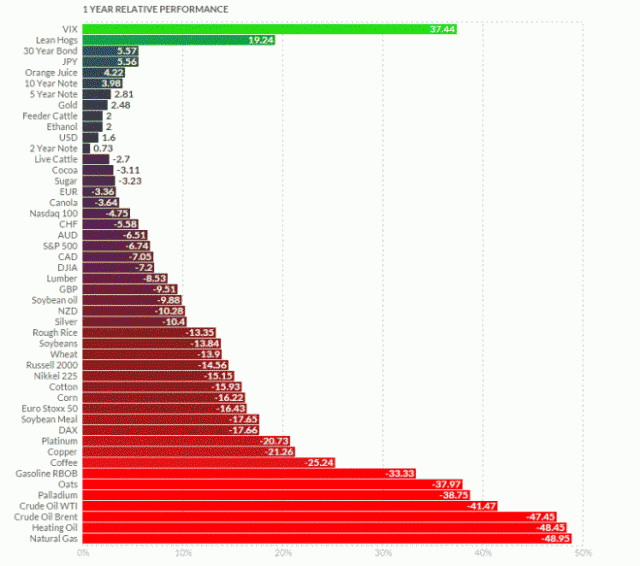 一年前からの変化を見ると先物市場に上場されている商品は圧倒的に下落しているものが多いのがよく分かります。そんな中、最も上昇したのはVIXでした。なんと37.44%の上昇となっています。その次は豚。PEDという豚の病気でここ数年豚の価格は上昇しており、それが続いているということです。金融商品では米国30年国債、そして日本円。貴金属ではゴールドがかろうじてプラス、あとはやはり長期・短期の米国債がかろうじてプラス。しかし、下落した商品を見ると、まずその数の多さに圧倒されます。ほとんどの上場商品が過去一年で下がり、それも20%を超えるような大きな下げを記録している商品が10商品以上あり、中でもエネルギー関連の商品、Natural Gas(天然ガス)、Heating Oil(灯油)、Crude Oil Brent(ブレント原油)は軒並み50%近い下げを記録しています。その次はCrude Oil WTI(WTI原油)であり、下落率のワースト4は全てエネルギー、原油関係ということになります。そして、それに続くのがパラジウムで、一年で38.75%の下落となっています。