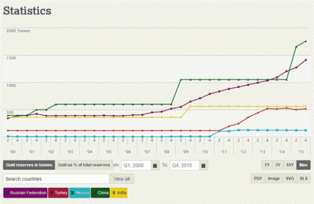 この国々の中でも最も注目すべきはロシアです。昨年もっとも多くのゴールドを買った中央銀行はロシア中央銀行です。2015年は208.4トンのゴールドを購入し、ロシア中央銀行のゴールド保有高は1415トンとなり、1年で17%の増加となりました。これによりロシアの外貨準備におけるゴールドの占める割合は11.96%から13.18%に上昇しました。2016年1月には21.8トンものゴールドを買い、これは昨年11月と同じレベル。ちなみに10月には18.66トン、9月には34.2トンと、2007年から着実にゴールドの保有量を増やしています。上のチャートを見ても分かるようにほぼ毎月着実に10トン以上のゴールドを買い続けています。