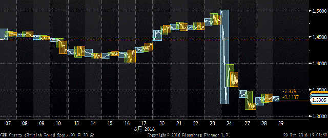 6月24日金曜日、まさかの英国国民投票の結果が「離脱」となった時、市場は大きなショックを受けました。僕も含めまさか離脱にはならないであろうとみんながみんな思っていました。それを覆す結果になりそうとなった時から、ゴールドは大きく買われ、日経平均は暴落、円高、ポンド安の大荒れのとなりました。ゴールドは金曜日東京朝の時点で1260ドルを割り込んでいました。英国EU残留を見込んで、この週(21日から)はゴールドは利食いと見られる売りで、1300ドル近くから1260ドル割れまでじわじわ下落を続けていました。そして迎えた投票開票でした。市場の思惑とはまったく逆の結果となったことで、ゴールドは金曜日の東京時間午後、1257ドルから一時1358ドルとほぼ100ドル上昇しました。その後はさすがに利食いの売りも出て1310?1340ドルのレンジでの神経質な取引となりました。