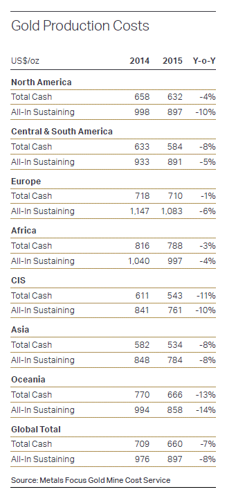 今週はMetals Focus発行の「Gold Focus 2016」から、最新のゴールドの生産コストを見てみます。