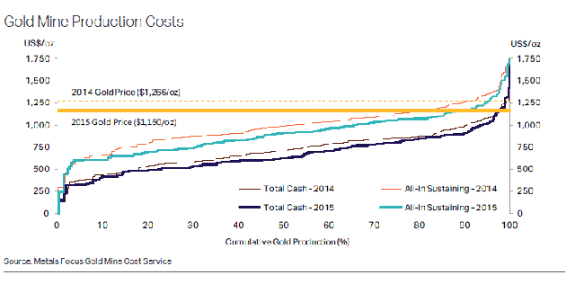2015年のトータルキャッシュコストの平均は7%下落して$660ドル。これは2011年以来の低いレベル。維持費すべて込みのオールインコストは3年連続で下落し、$897。これは2014年より8%、$263も安くなり、2012年に比べるとなんと19%もダウンしています。ただゴールドの価格自体が下がっているため、オールインコストに対する相場との差、つまり利益マージンは2014年の$291から2015年は$263に低下し、その結果2015年のオールインコストベースでは、ゴールド鉱山業界で採算があっていないのは、わずか16%に過ぎなくなりました。