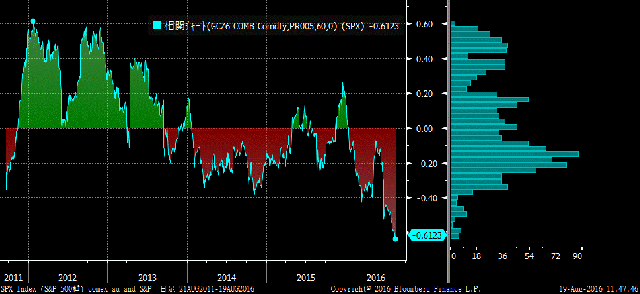 過去60セッションベースのComex GoldとS&P 500の相関関係はマイナス0.61。相関関数は1からマイナス1の間で表現され、1は完全な相関関係、0は全くの無関係、マイナス1は完全な逆相関を表します。