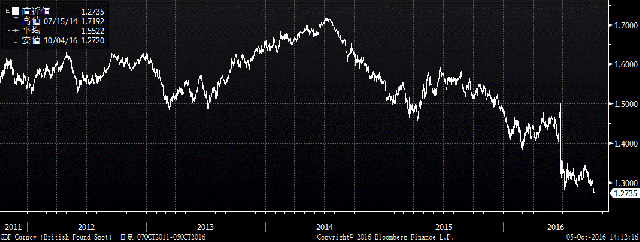 10月4日火曜日、ゴールドが1310ドルから5日の早朝には1266ドルまで44ドルの急落、円建てでも4310円から4185円と一時125円の下落となりました。その引き金になったのは英ポンドの急落です。ポンドは対ドルで1.30を割り込み、過去30年での最安値レベルに来ています。Brexit以来、ポンドはその価値を下げ続けています。新たなメイ政権が強硬姿勢で欧州連合との離脱交渉に臨むという見方から、金融市場ではロンドンの市場としての機能に疑問符が付いているということでしょう。