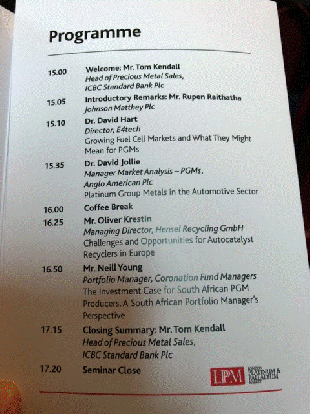 今週はロンドン・プラチナウィークに参加してきました。相変わらずの弾丸スケジュールで行ってきました。月曜日に出て、木曜日に帰国という2泊4日のスケジュール。年に一回毎年5月のこの週に世界中からプラチナビジネスの関係者が一斉にロンドンに会し、中心となるLPPM(London Platinum and Palladium Market)の中核企業が、それぞれこの一週間に、Breakfast、LunchそしてCocktail とDinnerという形で、それぞれの顧客および取引先を招待して行うというものです。今年の人数がどれくらいのものかはまだ発表されていませんが、例年500人以上が世界中からロンドンに集います。ここに行けばほぼ確実に多くの業界関係者と会って話すことができるという意味で、便利な機会であると言えます。また、その年のマーケットに対する参加者たちの考えを聞くこともでき、調査会社のPGMの需給の見通し発表もこの週のロンドンで皮切られます。