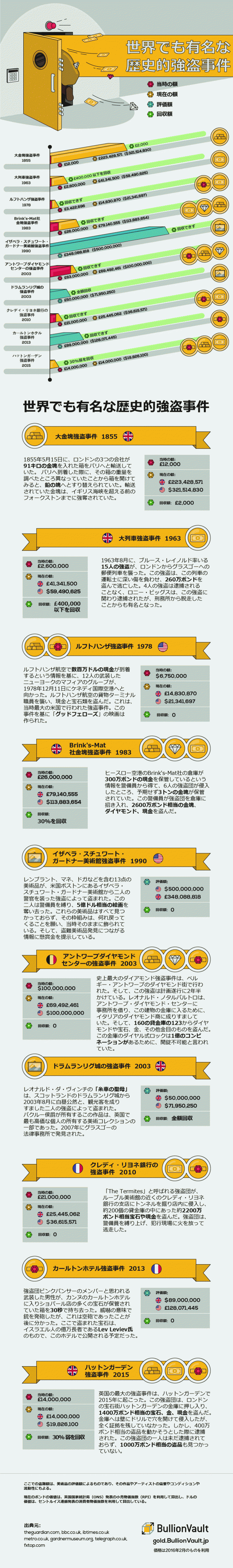 それでは、次のインフォグラフィックで、ハットンガーデン強盗事件を含め、歴史的な強盗事件の詳細をご覧ください。