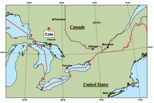 コテ金開発プロジェクトは、カナダのオンタリオ州、ティミンズ市の南南西約 120km に