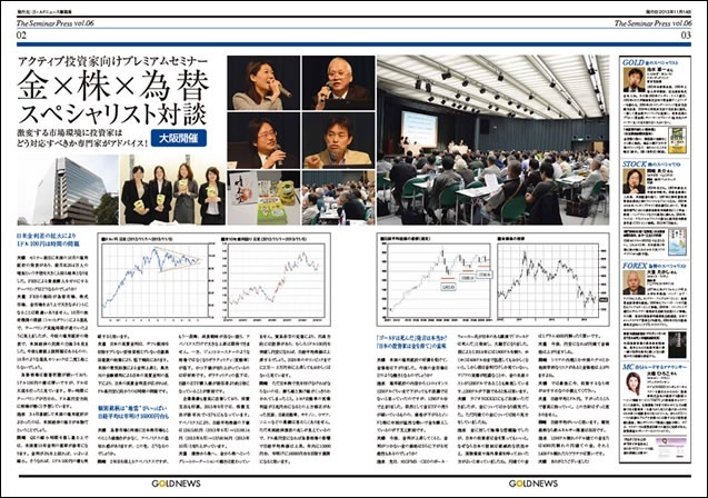 ゴールドフェスタ運営事務局は、2013年11月9日(土)に大阪・梅田「オーバルホール」にて、TOKYO GOLD FESTIVALスピンオフ Vol.7 視野を広げマクロな視点で考えるスピンオフセミナー『金×株×為替 : スペシャリスト対談“秋の陣” in 大阪』を開催。(後援:東京金融取引所、東京商品取引所、協賛:豊商事)