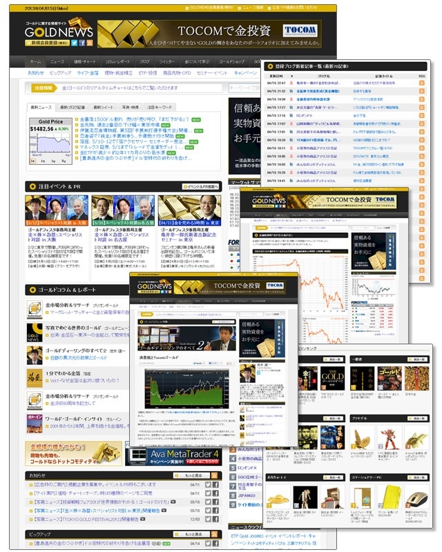 「金・ゴールド」というキーワードで集めたニュースから、プロフェッショナルや関係企業によるゴールドに関するコラム、そして価格・チャート、ブログ&ツイッターの集約&タイムライン化、そしてゴールドに関する商品だけを集めたゴールドショップまで、サイト全てをゴールドという軸で構成しています。