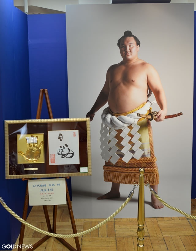 今回の大黄金展の入り口には、横綱・白鵬関のパネルが設置され、その前には純金約300gを使用した白鵬関の「手形」も展示。