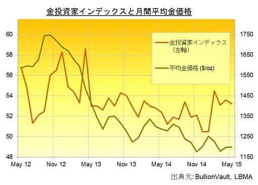 ? 金投資家インデックスは、金投資傾向は高まる中5月に53.2と下げた。