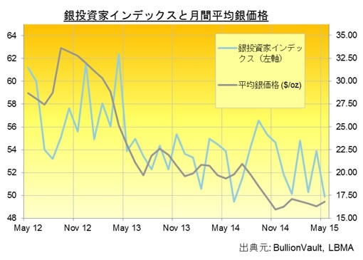 金投資家インデックスとは対照的に、銀投資家インデックスは5月に大きく下げ、49.9とマイナスの数値となった。
