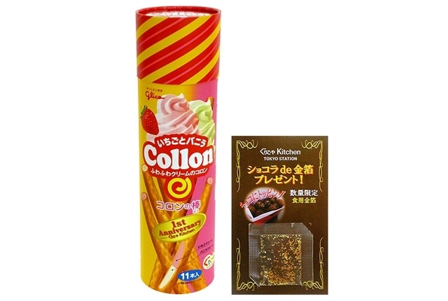 江崎グリコが、東京駅一番街 地下 1階 「 東京おかしランド 」 内で展開する 『 ぐりこ ・ や Kitchen 』 が 2013年4月14日(日)で 1周年を迎える。 開業1周年を記念して、同日より 『 コロンの棒 < いちごとバニラ > 』 を数量限定発売。また、店内製造のチョコレート 2個お買上げのお客様にチョコに振りかける食用金箔をプレゼントする “ ショコラ de 金箔プレゼント ! ” も同日から実施。