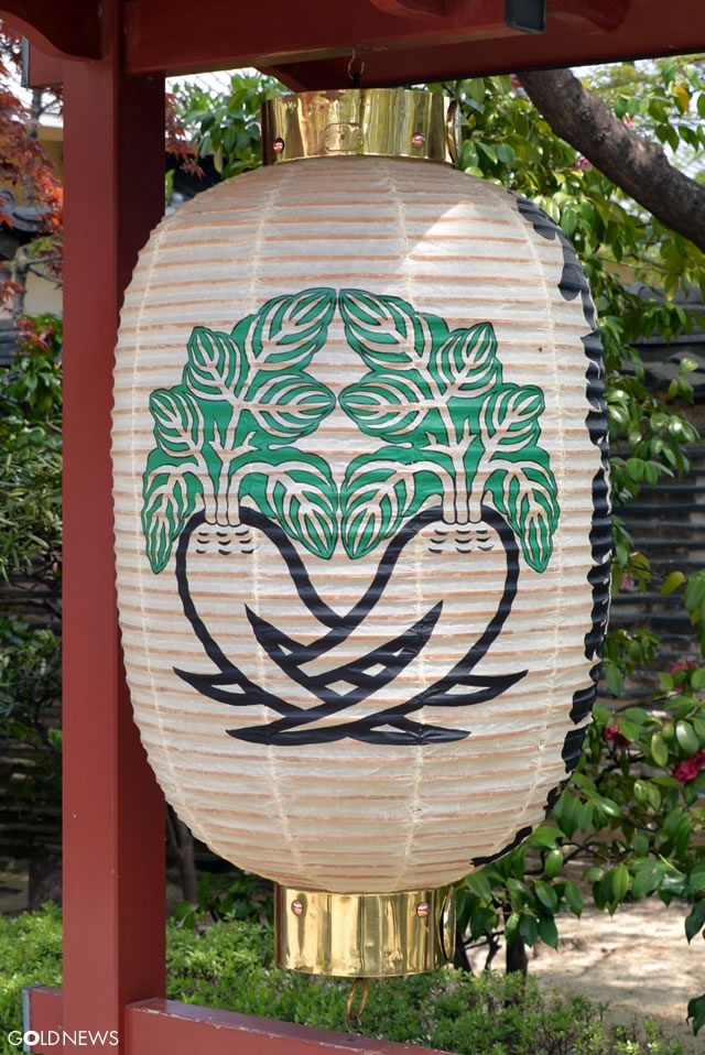 こちらは提灯に二股大根が絡み合っている様。大根は夫婦和合、縁結び、子孫繁栄を表すもので、巾着は財宝で商売繁盛を表しています。