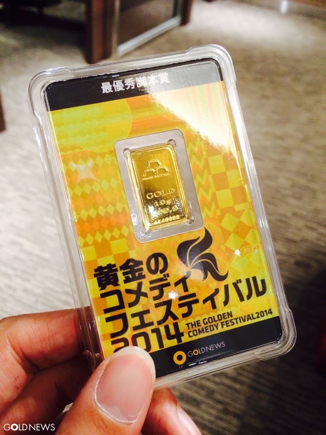 最後に、今回協賛としてゴールドニュースからは最優秀脚本賞・最優秀俳優賞に選ばれた方に「黄金のコメディフェスティバル2014 ゴールドインゴットバー」(10g・約5万円弱)をそれぞれ提供させて頂きました。