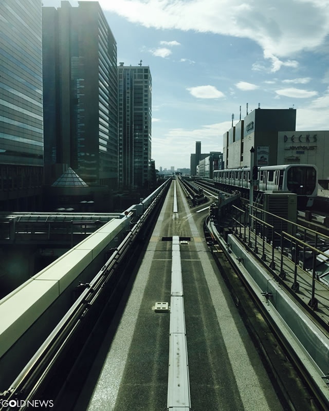 お台場へは「ゆりかもめ」か「りんかい線」でどうぞ。こちらの写真は「ゆりかもめ」の最前車両からの風景。運転手がおりませんので、こんな景色を楽しめます。