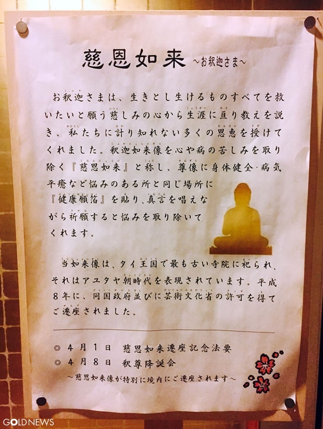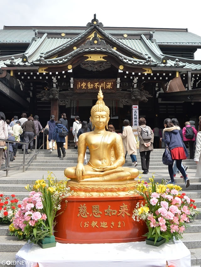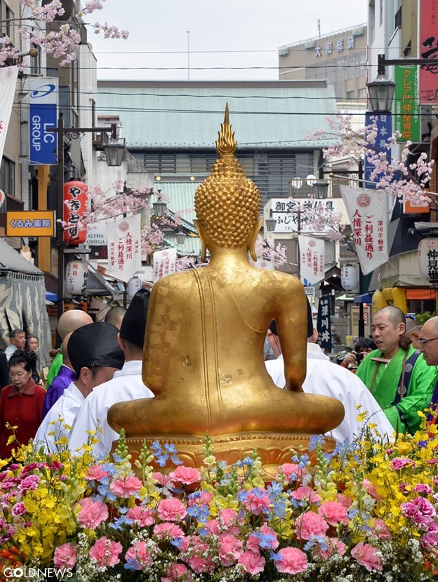 深川不動堂に祀られている金色のお釈迦様(慈恩如来様)は、平成8年にタイ王国より遷座されたもので、4月1日のお練り行列では山伏先導で沢山の花に囲まれた慈恩如来様が、僧侶とともに本堂にむけて練り歩きます。
