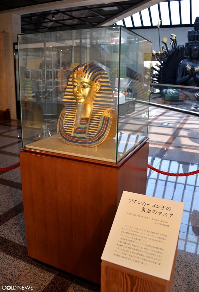入り口で出迎えるのは「ツタンカーメンの黄金マスク」。金(ゴールド)が続きます。館内は撮影禁止でしたので、写真はこの1点だけ。