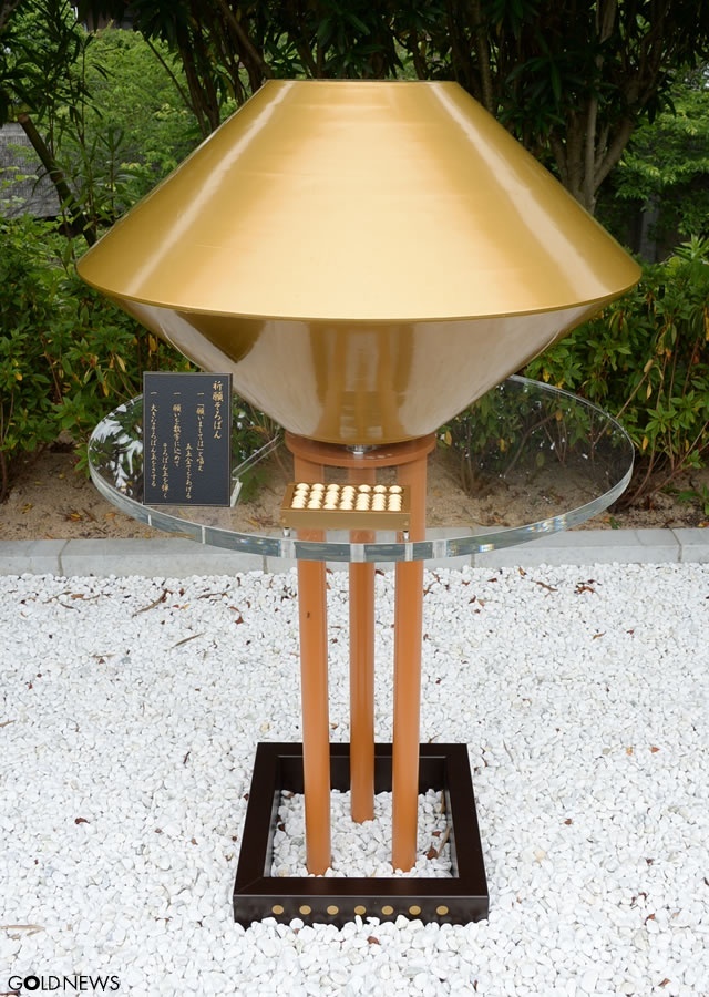 巨大そろばんの前に設置された黄金のそろばんモニュメント。アクリル板の上に直径85センチ、高さ50センチの金色のそろばん玉一つと、通常より大きめの7桁のそろばんが設置されています。