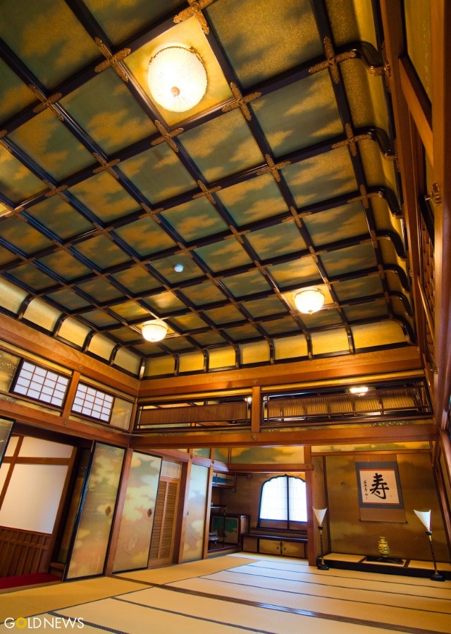 西洋建築である1・2階は、現在レストラン(旧応接間)、喫茶(旧煙草の間)、ブティック(旧サンルーム)となっており、この優雅なフォルムの美しい階段より上は通常非公開エリアで、純和風の書院造りの和室と煌めく黄金ゾーンが広がります。