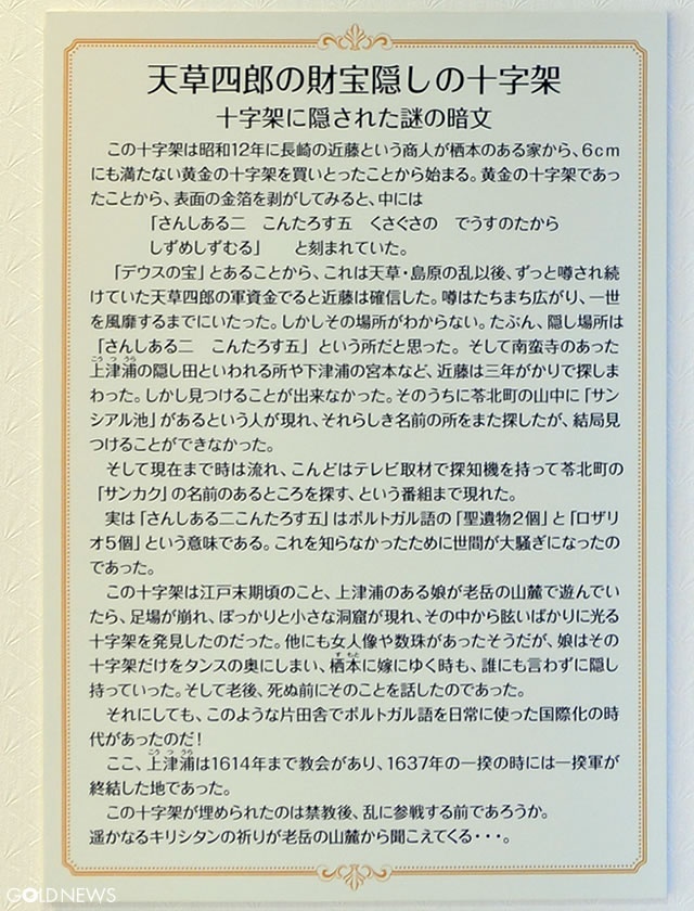 この黄金の十字架の暗文は「天草四郎財宝伝説」のカギを握るものとされてきました。