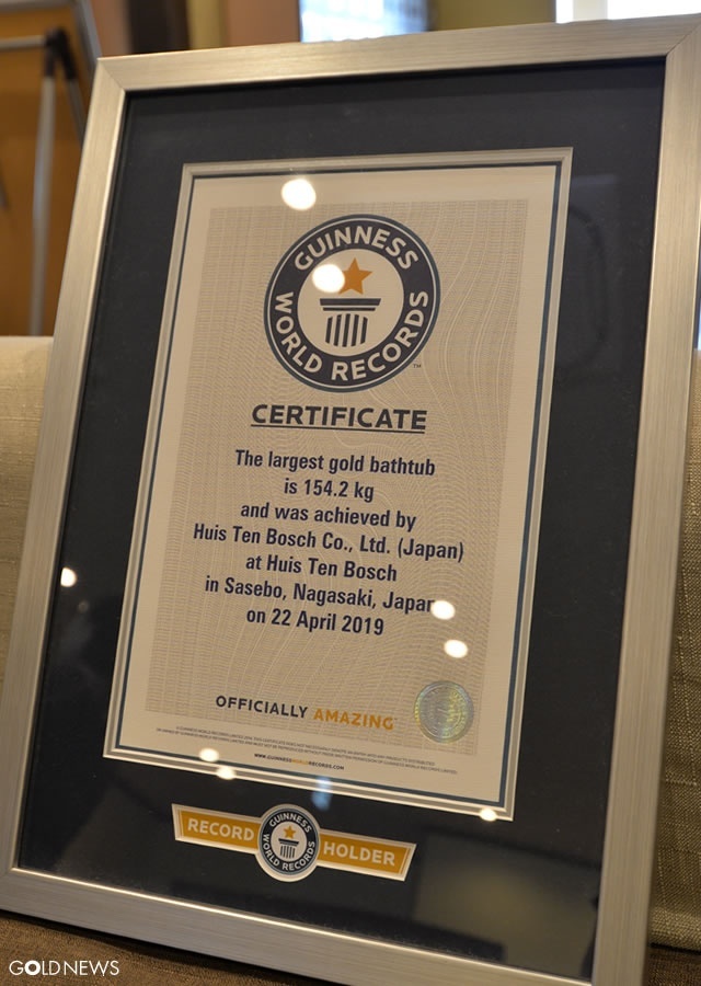 こちらがギネス認定の証明書。18金で制作された本体重量154.2㎏の世界最大の黄金バスタブとしてギネス認定を受けています。
