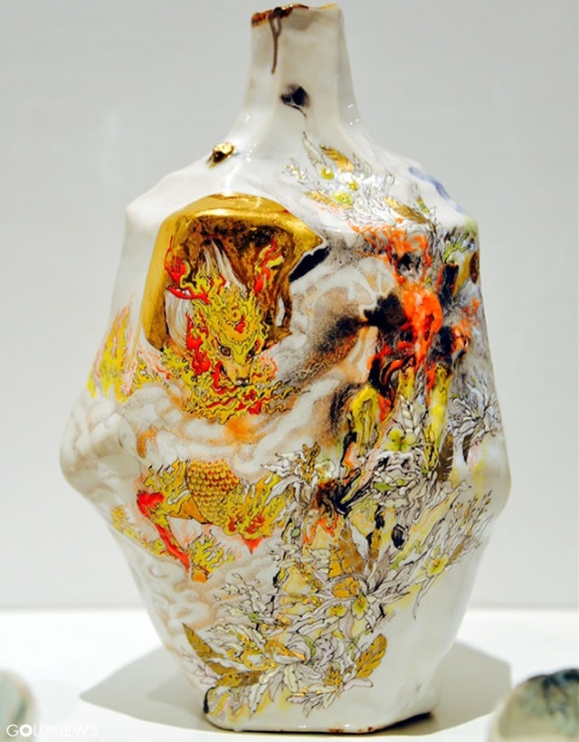 筆先の細い筆を使い細かく描きその上に様々な色の和絵の具や金銀彩を重ねていくのが現在のスタイル。素材の物質感にただ拘泥するのではなく、現代の生活においての陶磁の役割を思索しながら作品にしていくことを目標としている。