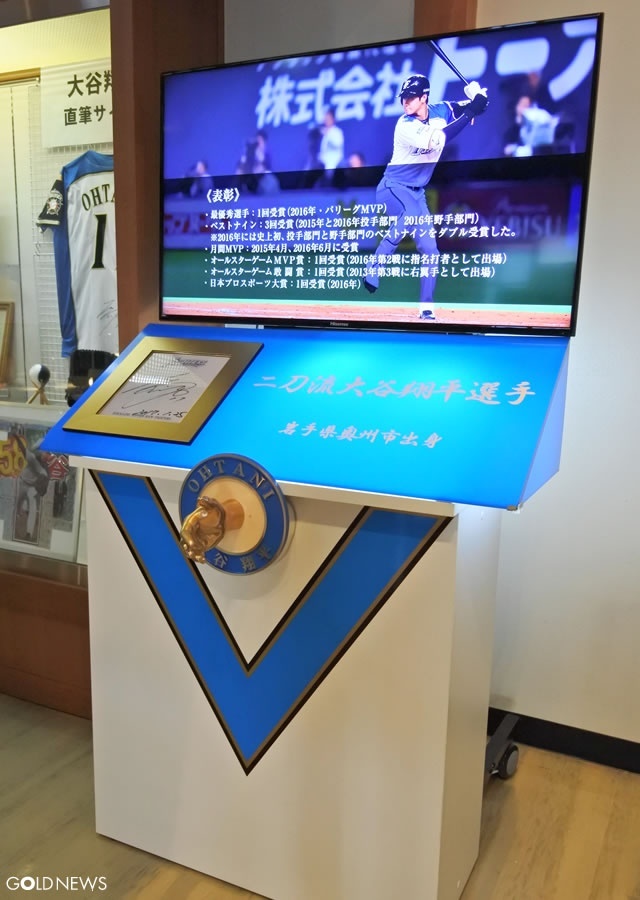 大谷選手の黄金の握手像はホールの左手に直筆サイン入りユニホームやグローブ、バットなどとともに展示されています。
